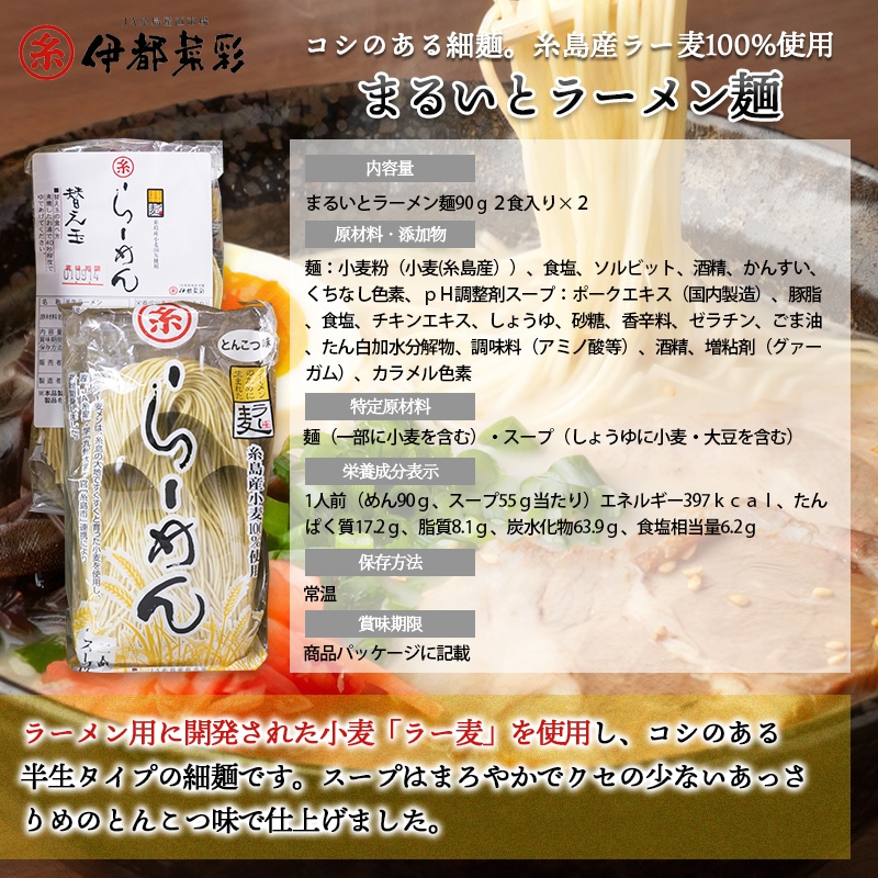 | まるいとラーメン麺 | 食品表示 めん:小麦粉(小麦(糸島産))、食塩/ソルビット、酒精、かんすい、くちなし色素、pH調整剤、(一部に小麦を含む) スープ:ポークエキス(国内製造)、豚脂、食塩、チキンエキス、しょうゆ(小麦・大豆を含む)、砂糖、香辛料、ゼラチン、ごま油、たん白加水分解物/調味料(アミノ酸等)、酒精、増粘剤(グァーガム)、カラメル色素 成分表示 1人前(めん90g、スープ55g当たり)エネルギー397kcal、たんぱく質17.2g、脂質8.1g、炭水化物63.9g、食塩相当量6.2g 替え玉(めん90g当たり)エネルギー278kcal、たんぱく質8.0g、脂質1.1g、炭水化物59.1g、食塩相当量0.6g |