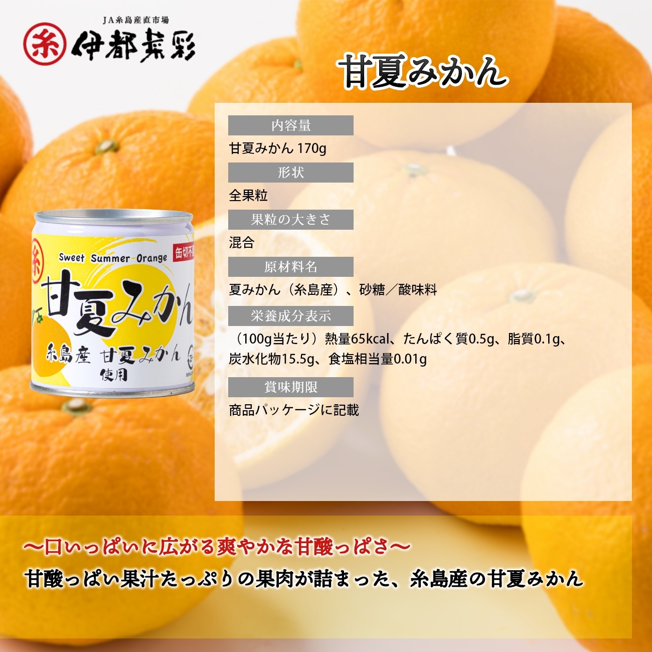 | 甘夏みかん | 食品表示 夏みかん(糸島産)、砂糖、酸味料 成分表示 (100g当たり)エネルギー65kcal、たんぱく質0.5g、脂質0.1g、炭水化物15.5g、食塩相当量0.01g |