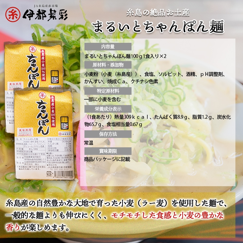 | まるいとちゃんぽん麺 | 食品表示 小麦粉(小麦(糸島産))、食塩/ソルビット、酒精、pH調整剤、かんすい、焼成Ca、クチナシ色素、(一部に小麦を含む) 成分表示 (1食あたり)熱量309kcal、たんぱく質8.9g、脂質1.2g、炭水化物65.7g、食塩相当量0.67g |