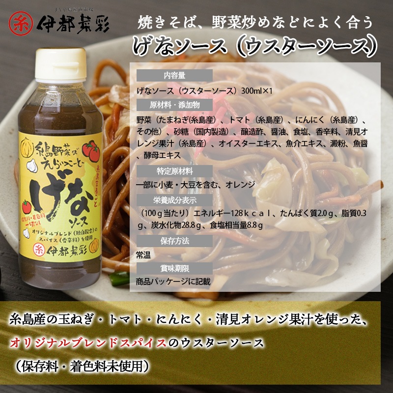 | げなソース(ウスターソース) | 食品表示 野菜(たまねぎ(糸島産)、トマト(糸島産)、にんにく(糸島産)、その他)、砂糖(国内製造)、醸造酢、醤油、食塩、香辛料、清見オレンジ果汁(糸島産)、オイスターエキス、魚介エキス、澱粉、魚醤、酵母エキス、(一部に小麦・大豆を含む) 成分表示 (100g当たり)エネルギー128kcal、たんぱく質2.0g、脂質0.3g、炭水化物28.8g、食塩相当量8.8g |