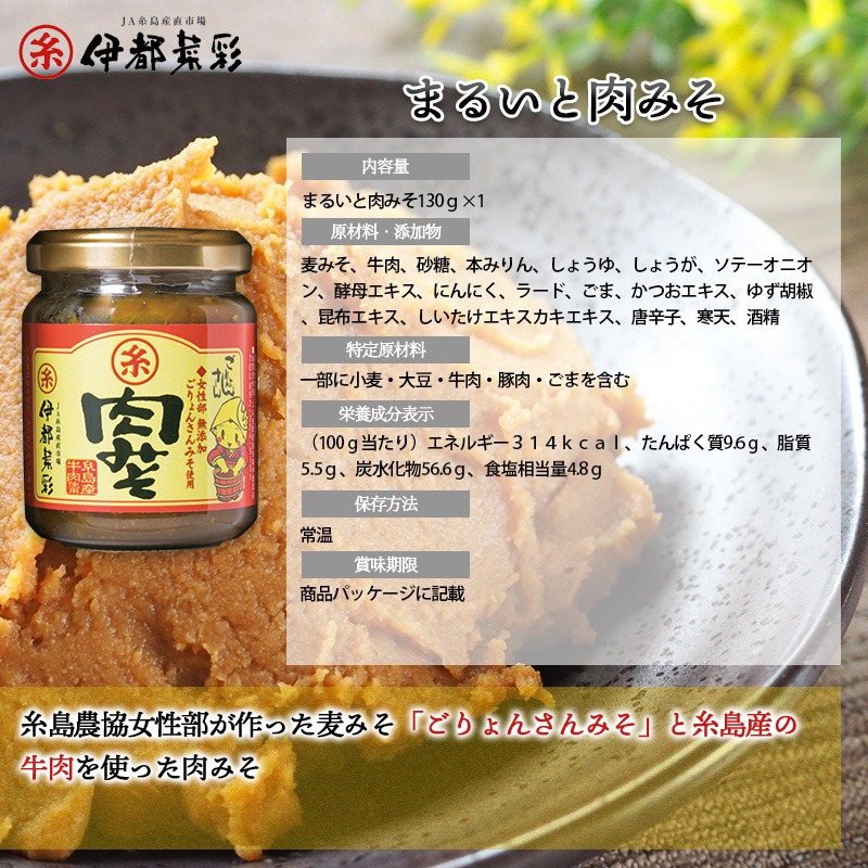 | まるいと肉みそ | 食品表示 小麦みそ、牛肉、砂糖、本みりん、しょうゆ、しょうが、ソテーオニオン、酵母エキス、にんにく、ラード、ごま、かつおエキス、ゆず胡椒、昆布エキス、しいたけエキスカキエキス、唐辛子、寒天/酒精/一部に小麦・大豆・牛肉・豚肉・ごまを含む 成分表示 (100g当たり)エネルギー314kcal、たんぱく質9.6g、脂質5.5g、炭水化物56.6g、食塩相当量4.8g |