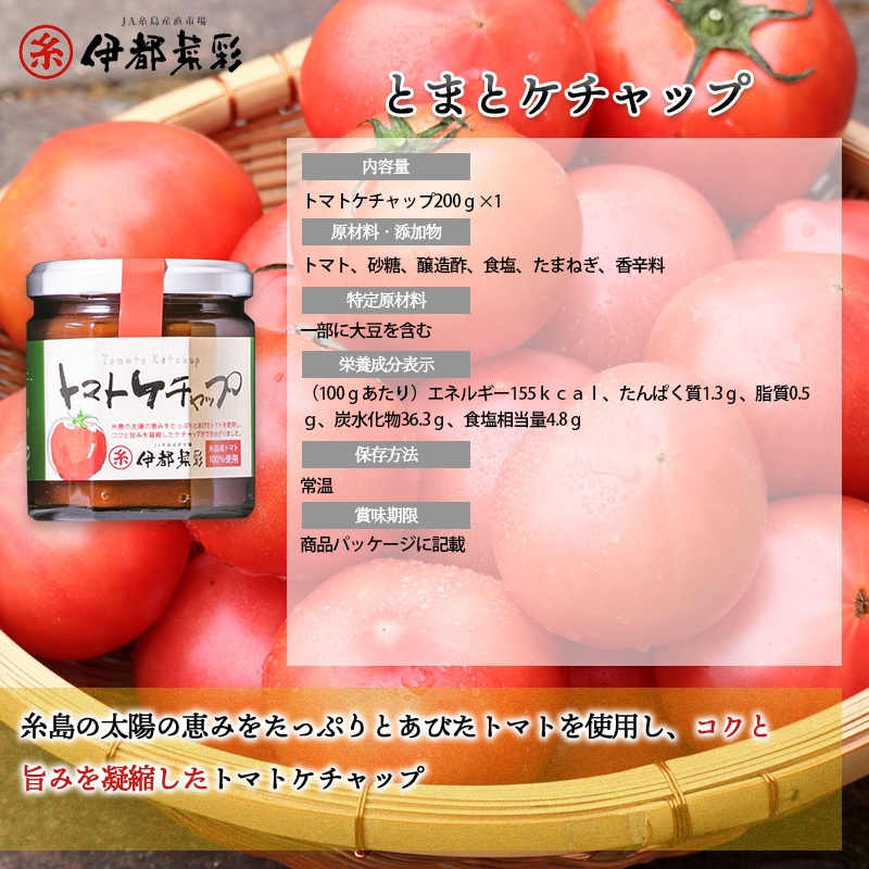 | トマトケチャップ | 食品表示 トマト、砂糖、醸造酢、食塩、たまねぎ、香辛料(一部に大豆を含む) 成分表示 (100gあたり)エネルギー155kcal、たんぱく質1.3g、脂質0.5g、炭水化物36.3g、食塩相当量4.8g |